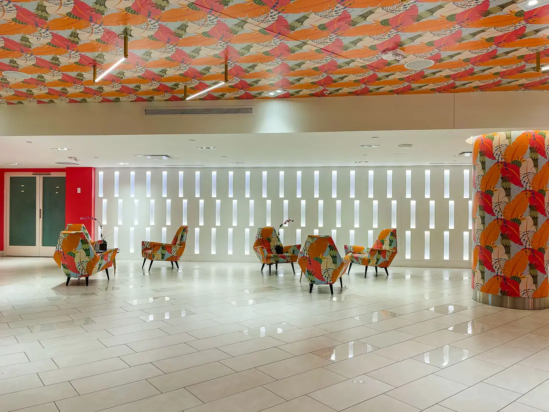 The water park is located down a ramp from the main American Dream stores. The ticket lobby is actually very pretty and has lounge chairs!